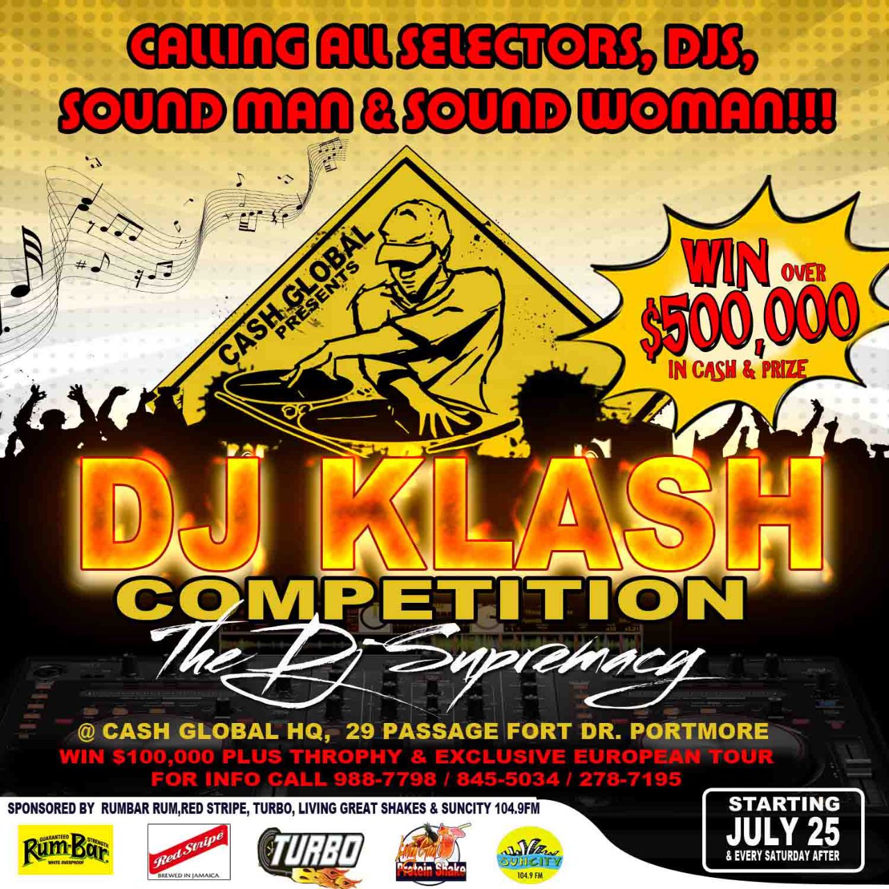 The DJ Supremacy competition is set to be one of the biggest and most supportive musical clash competition to date, hosted by Cash Global HQ night club along with backing sponsorship from many of the major companies in the island such as; Turbo Energy Drink, Rum Bar Rum, Red Stripe, Juice Valley Jamaica Ltd and media outlets Irie Fm and Sun City Radio to broadcast intervals of the events live to air from the opening night.
