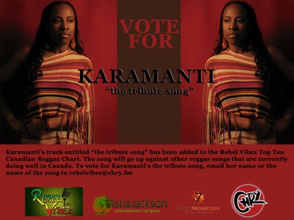 Karamanti’s track entitled “the tribute song” has been added to the Rebel Vibez Top Ten Canadian Reggae Chart. The song will go up against other reggae songs that are currently doing well in Canada. To vote for Karamanti’s the tribute song, email her name or the name of the song to rebelvibez@chry.fm